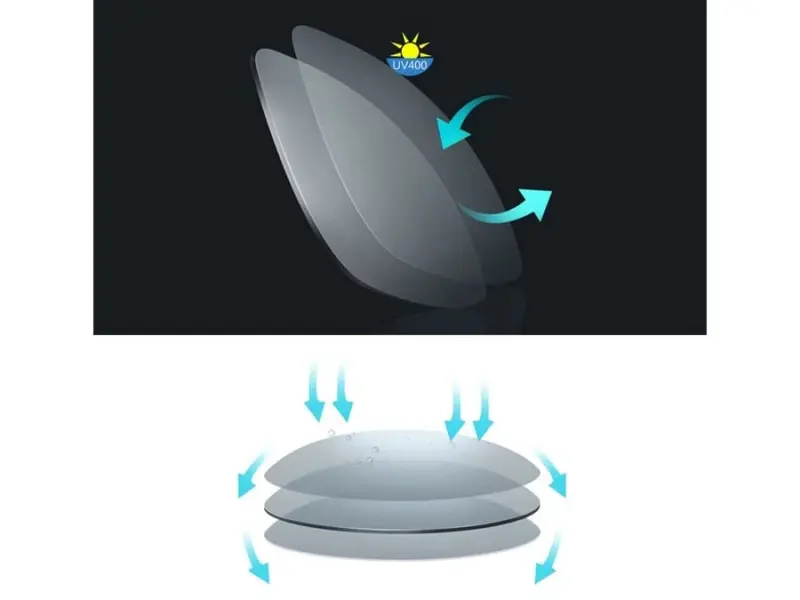 فناوری فیلتر چندلایهی آنها قادر است اشعههای مضر UVA، UVB و را تا 99 درصد مسدود کند و از چشمها در برابر نور شدید خورشید و آسیبهای ناشی از اشعهی فرابنفش محافظت نماید. علاوه بر این، پوشش نایلونی ضد لک و ضد چربی باعث میشود سطح عدسیها بهراحتی تمیز شود و همیشه ظاهری شفاف و تمیز داشته باشند.