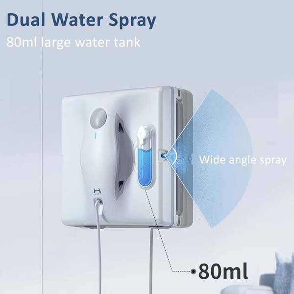 ربات شیشه پاکن هوشمند HUTT W8 دارای یک سیستم اسپری آب با دو نازل است که به صورت یکنواخت آب رو از مخزن 80 میلیلیتری دستگاه روی سطح شیشه پخش میکنه و با موتور براشلس Nidec ژاپنی و قدرت مکش 3800 پاسکال به صورت موثر شیشه رو تمیز میکنه. این حجم از آب برای تمیز کردن یک شیشه بزرگ معادل 35 متر مربع، کافیه. پدهای پارچهای شیشه پاک کن بدون جایگذاری رد آب یا لکه روی شیشه لکهها رو تمیز میکنه.