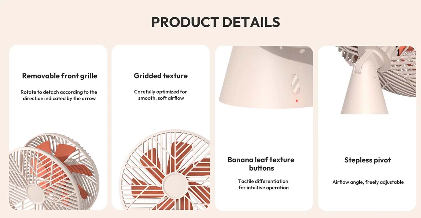 Sothing این بار به خاطر طراحیهای مینیمال و الهامگرفته از عناصر طبیعی شناخته میشود. این پنکه با مدل Forest Desktop Fan و ابعاد جمعوجور و بدنهای ساختهشده از پلاستیک ABS باکیفیت، روی هر میز کاری، کنار تخت خواب یا حتی قفسه کتاب، بهراحتی جا میگیرد. رنگهای ملایم و خطوط نرم طراحی، حس آرامش و هماهنگی را به محیط میآورد.